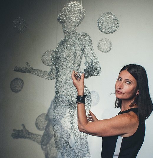 Creates hand-crafted sculptures and installations using wire mesh, light, and shadow. Explores technology, wildlife conservation, and women's rights through art.